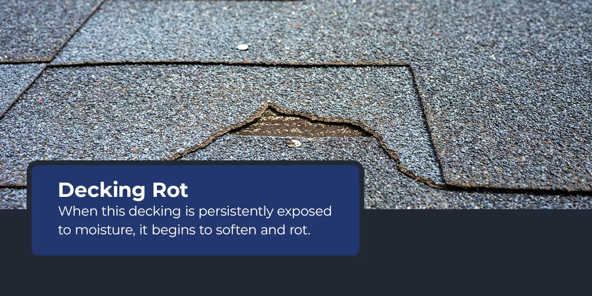 This weakened decking can no longer safely support the weight of the shingles or any foot traffic.